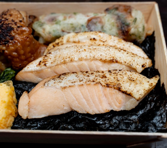 まず最初に紹介するのは「鮭ハラス塩焼き弁当」だ。人気No.1だそうで、販売ブースでも大々的にピックアップされている品。