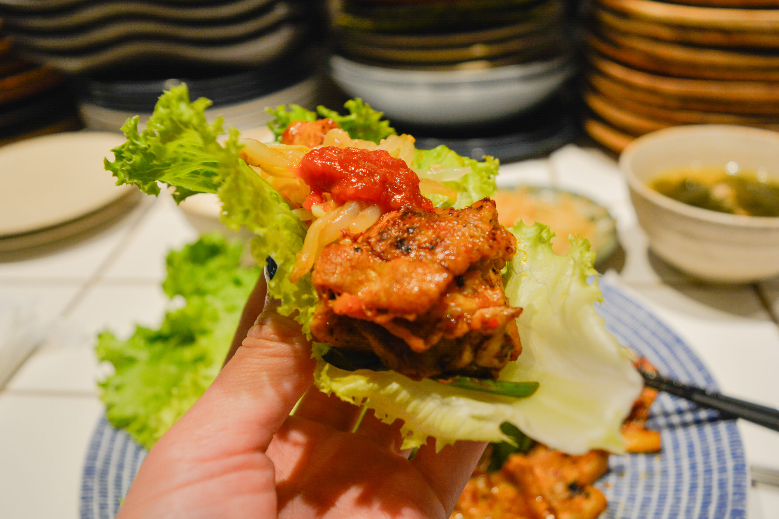 レタスで、チェユクポックム、サムジャン、そしてナムルを包んで、手でいただきます。