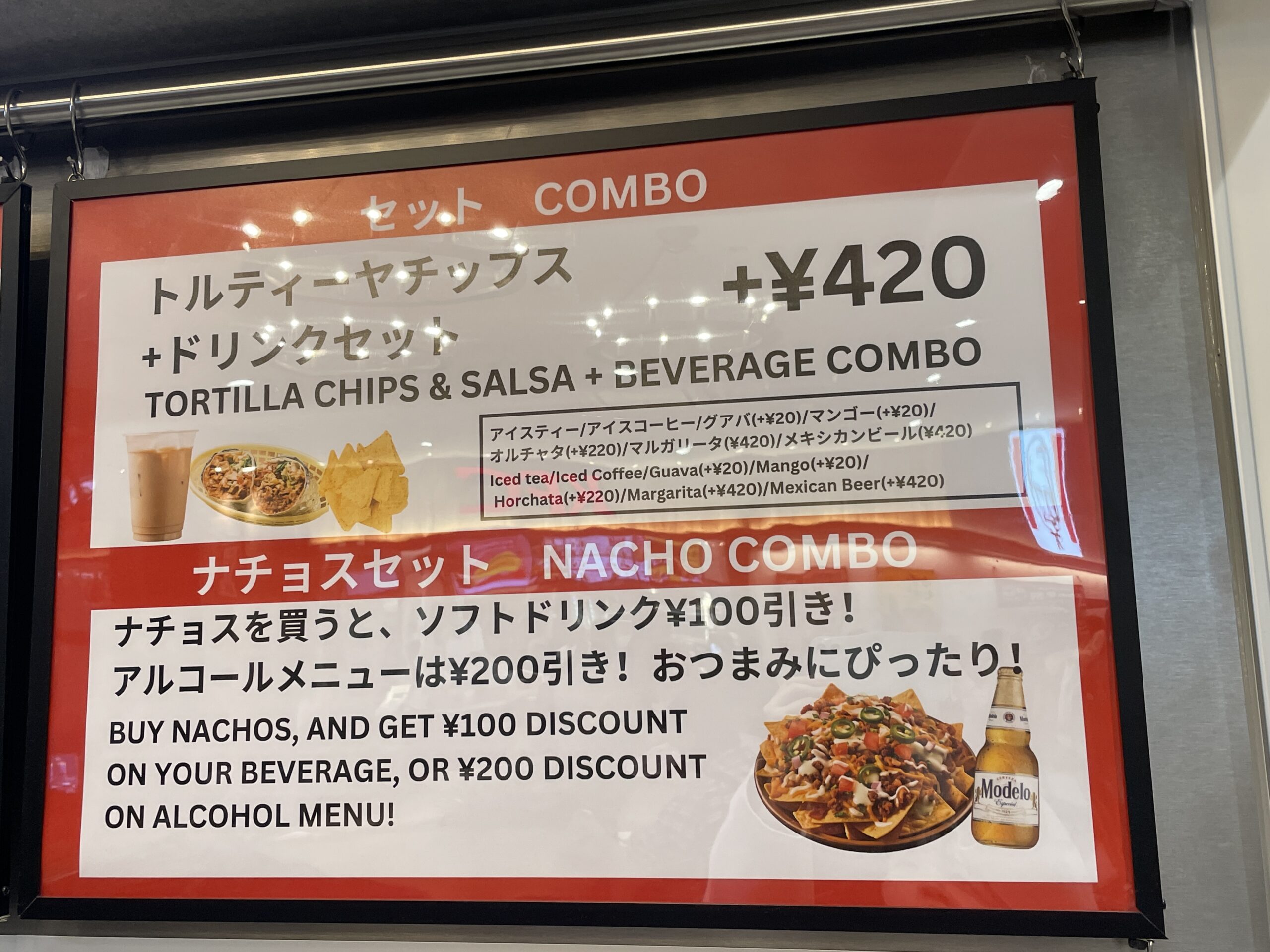 ブリトーの他にもトルティーヤチップスやナチョスが人気で、こちらはドリンクとのセットメニュー(420円・税込)や、ドリンクと買うと割引きになるお得なメニューもあります。