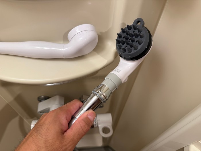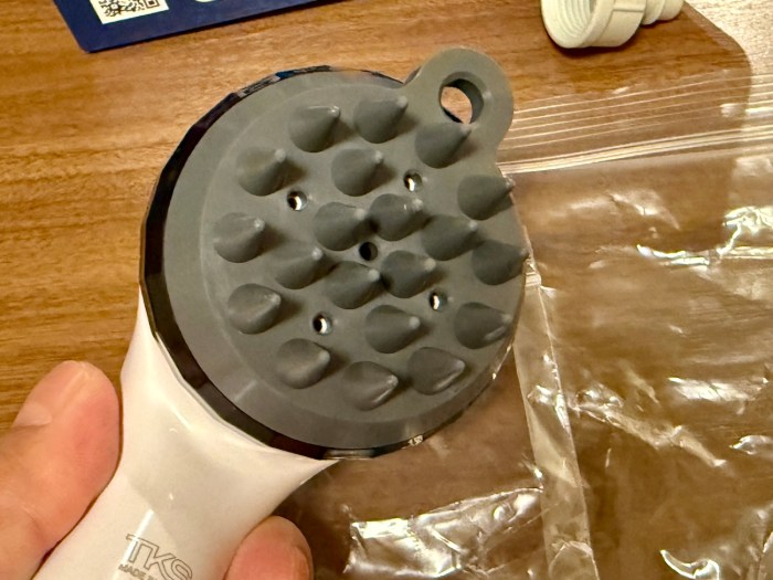 もちろんブラシをぐりぐりと押し当てることで頭皮の洗浄 & マッサージまで可能。なんなら打たせ湯的に肩や首に水流を当てるのもアリ。おかげで夏の汚れが一気にリセットされた。
