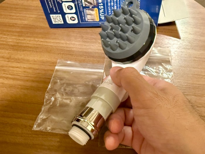 とはいえ、1万1000円……装着すると、普段使っているシャワーヘッドが一気にパワーアップした気がする。意外と小さい。だがしかし。