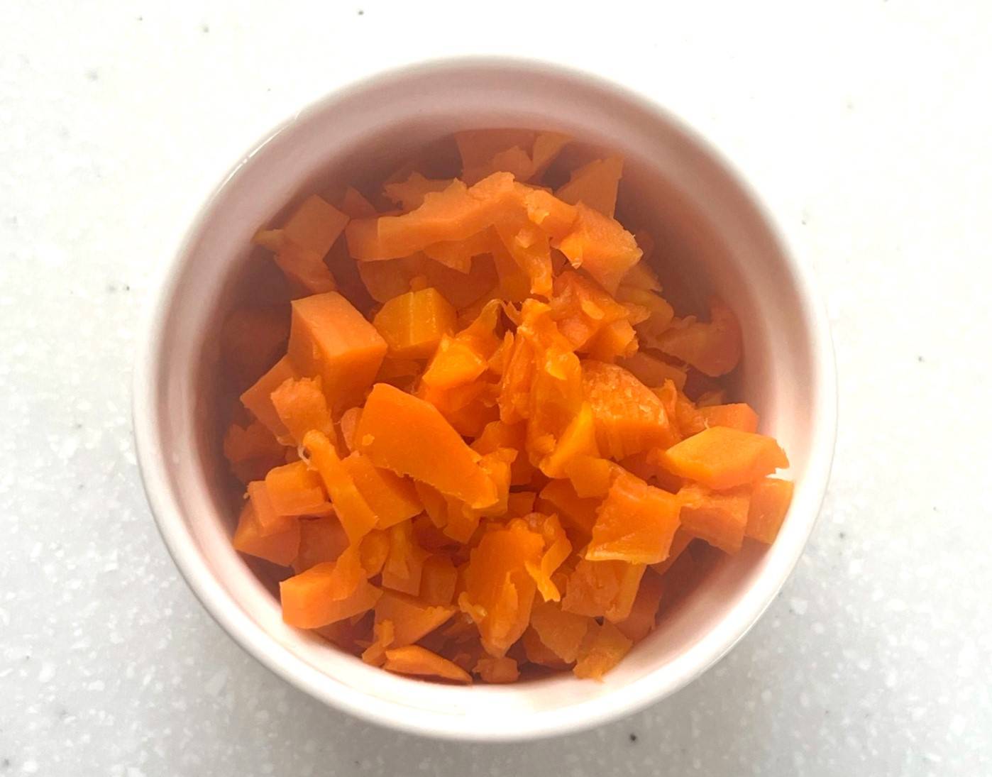 にんじんの食感が楽しめるよう、残りの半量はレンジで蒸して細かく刻んで加えます。