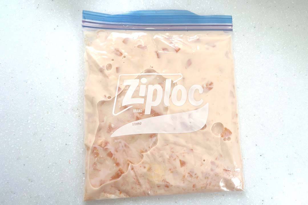 刻んだにんじんを混ぜ、ジッパー付き袋に入れたら平らにし、4~5時間凍らせます。