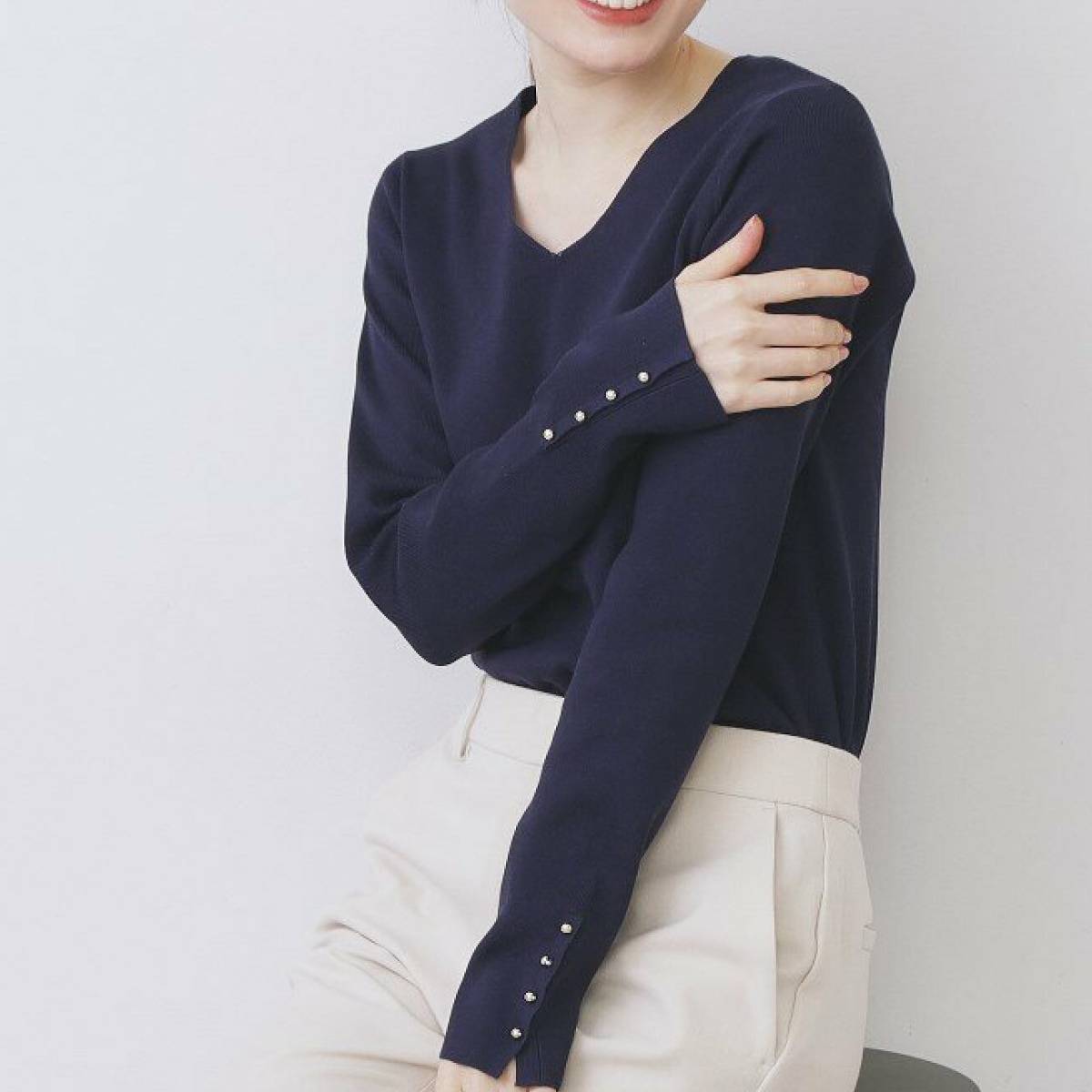 Vネックデザインのトップスは、顔まわり&デコルテがすっきり見えるところが◎