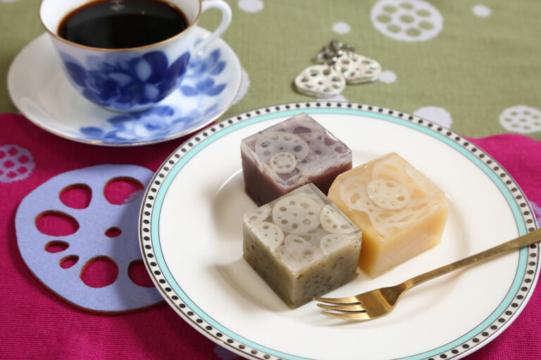 スライスされたレンコンが重なった見た目が美しく、ひと口食べるとシャキシャキとした食感もおもしろいんです。羊羹はむっちりとした歯触り!