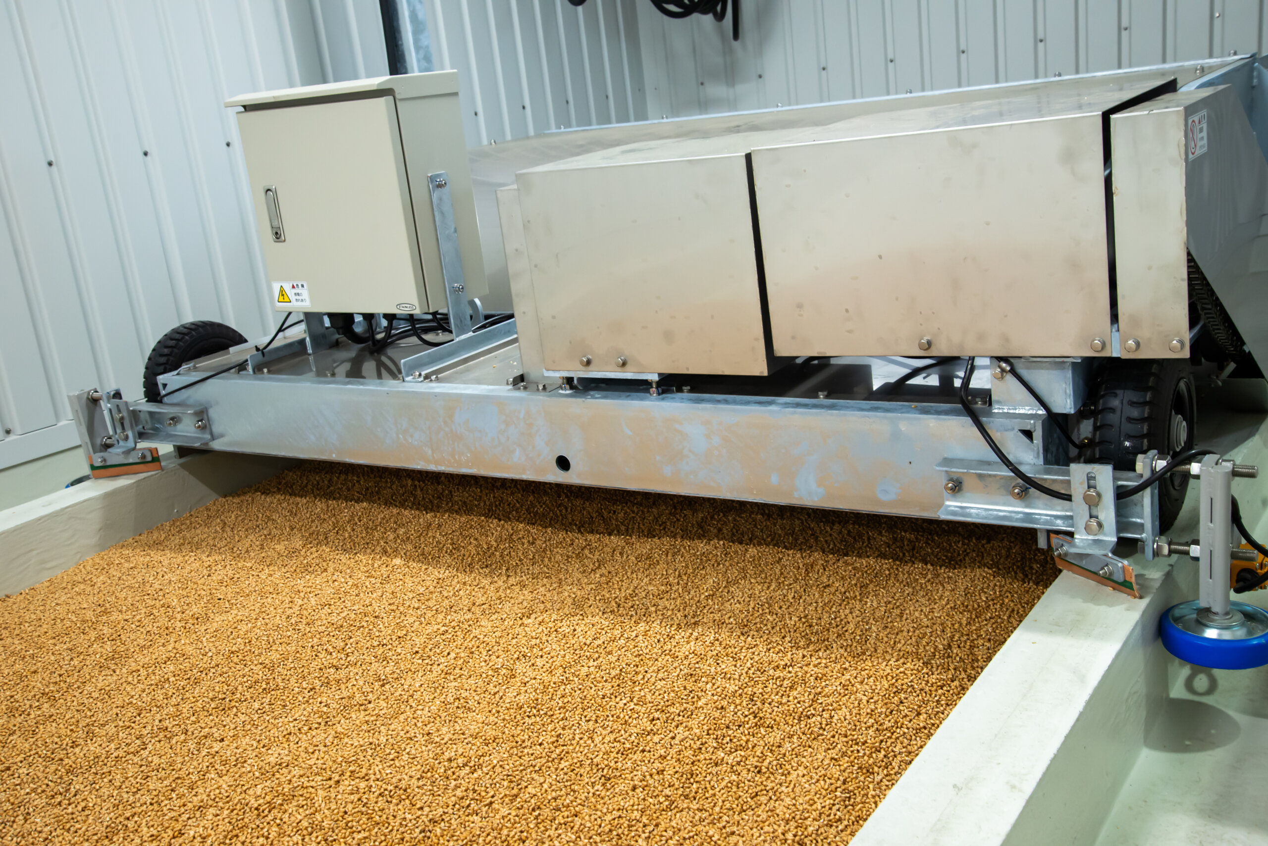幼根が見え始めた後、大麦を発芽させて大麦麦芽にしていきます。この作業で大事なのは、発芽のスピードを均一にするため撹拌作業です。