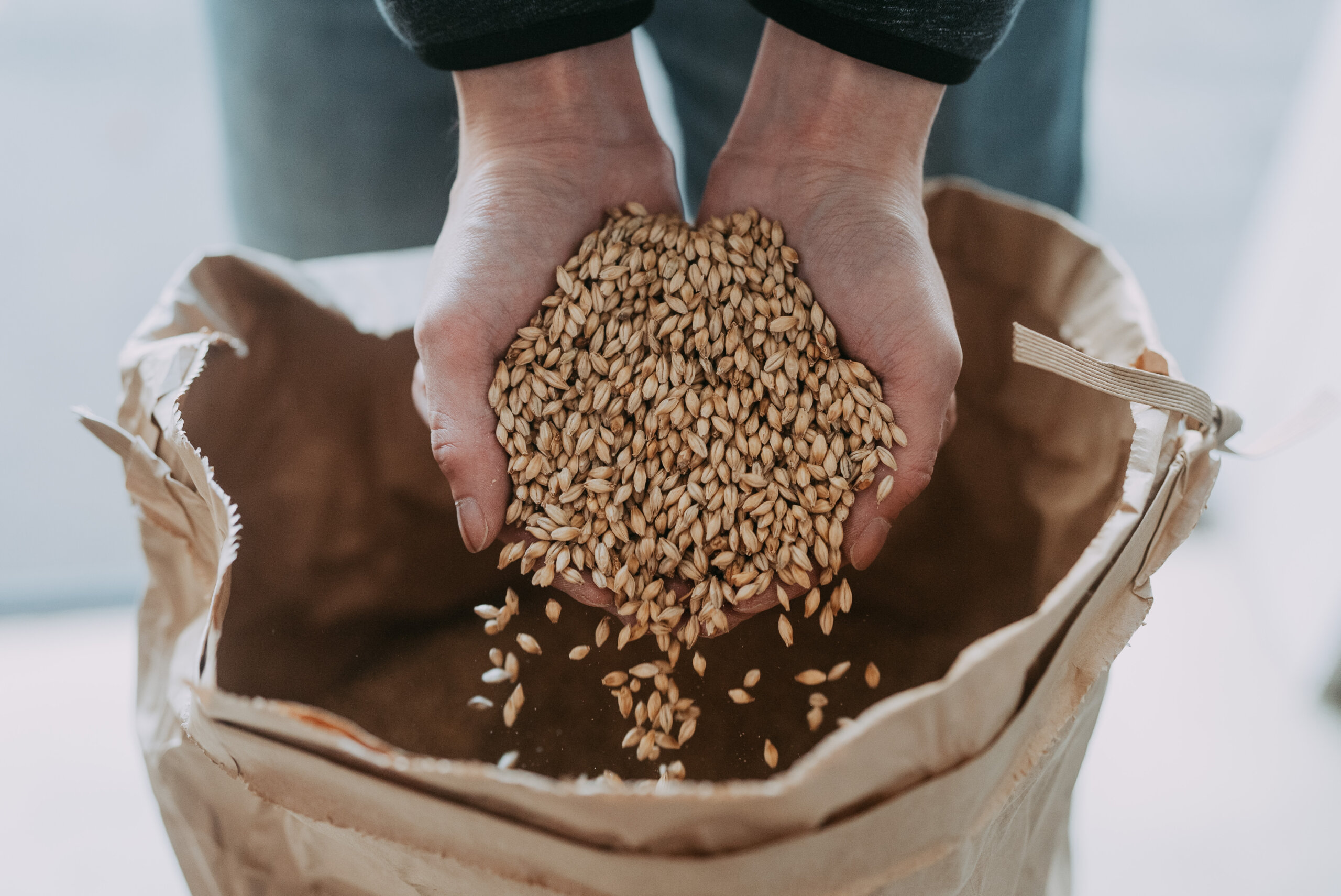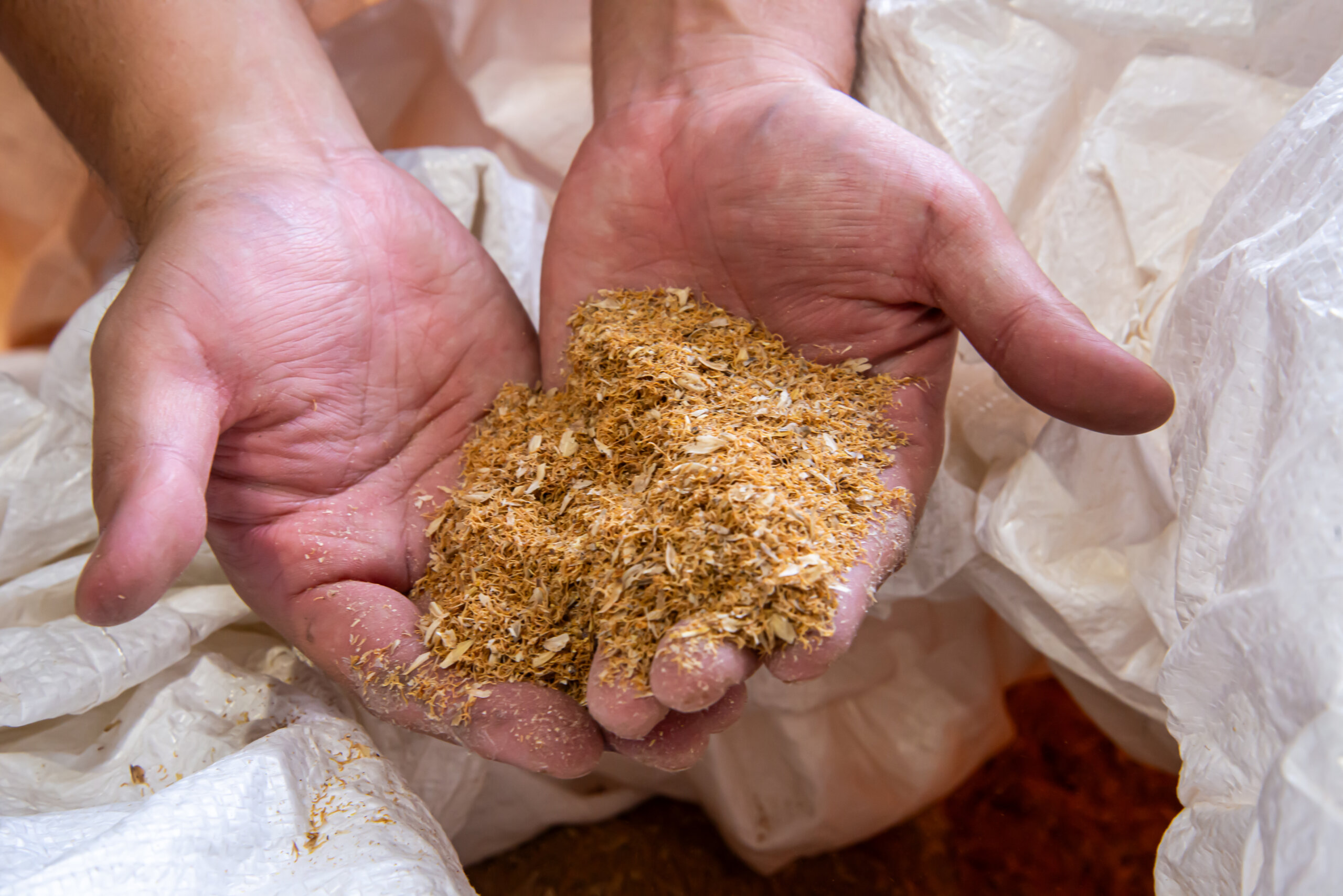 最後に、水分の再吸収を防ぐために、発芽の際に麦から伸びてきた根を取り除いてモルティングの作業は終わります。