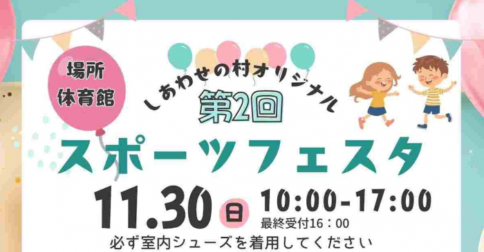 11月30日、神戸市北区の『しあわせの村』で「第2回 スポーツフェスタ」が開催されます。参加費は大人一人500円で、未就学児は大人一人につき一人まで無料です。