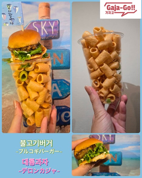 甘辛いプルコギ味のパティが挟まったミニバーガー🍔と、韓国の居酒屋で出てくるみんな大好きなデロンカジャ(韓国のお菓子)。