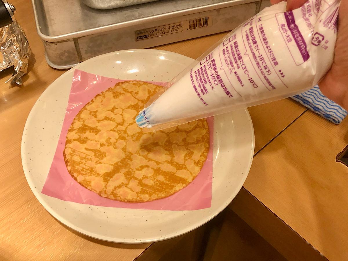 泣く泣くシメを諦めてデザートコーナーに行くと、「クレープ」の文字を見つけたので作ってみることに。