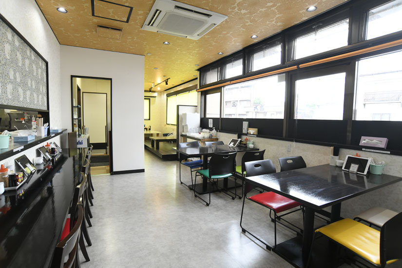 オープンキッチンの店内は,カウンター席、テーブル席、小上がり席を完備。カラフルなイスと大きな窓で明るい雰囲気が漂います。