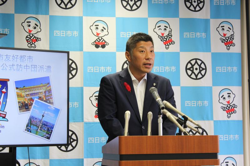 森市長が20日の定例記者会見で説明した。訪中団は森市長、村山繁生市議会議長、川口純史政策推進部長、清水浩一議会事務局長、宮原浩二環境部長と職員4人。四日市商工会議所会頭をはじめとする経済訪問団もほぼ同時期に訪中し、共に、現地で開催される友好都市提携45周年記念式典に参加する。