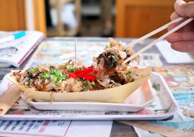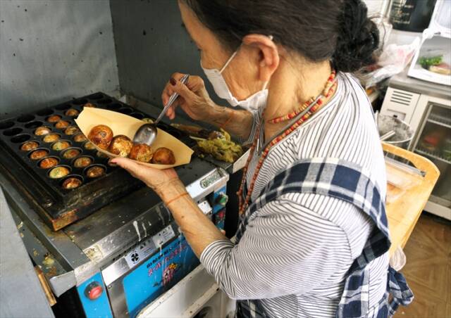 たこ焼きにもこだわりがある。70歳まで土建業を営んでいたというしんちゃんは、2016年のオープン前に有名店を食べ歩いて研究を重ねた。「冷凍だと味が落ちる」と考え、鳥羽市沖の菅島で仕入れた新鮮な生ダコを店でさばき、大きめに切って使用する。1皿650円で、季節のフルーツが添えられることもある。開店当初に導入した自動たこ焼き機は、スイッチひとつで生地が回転し、しんちゃんはそれを「踊るたこ焼き」と呼ぶ。