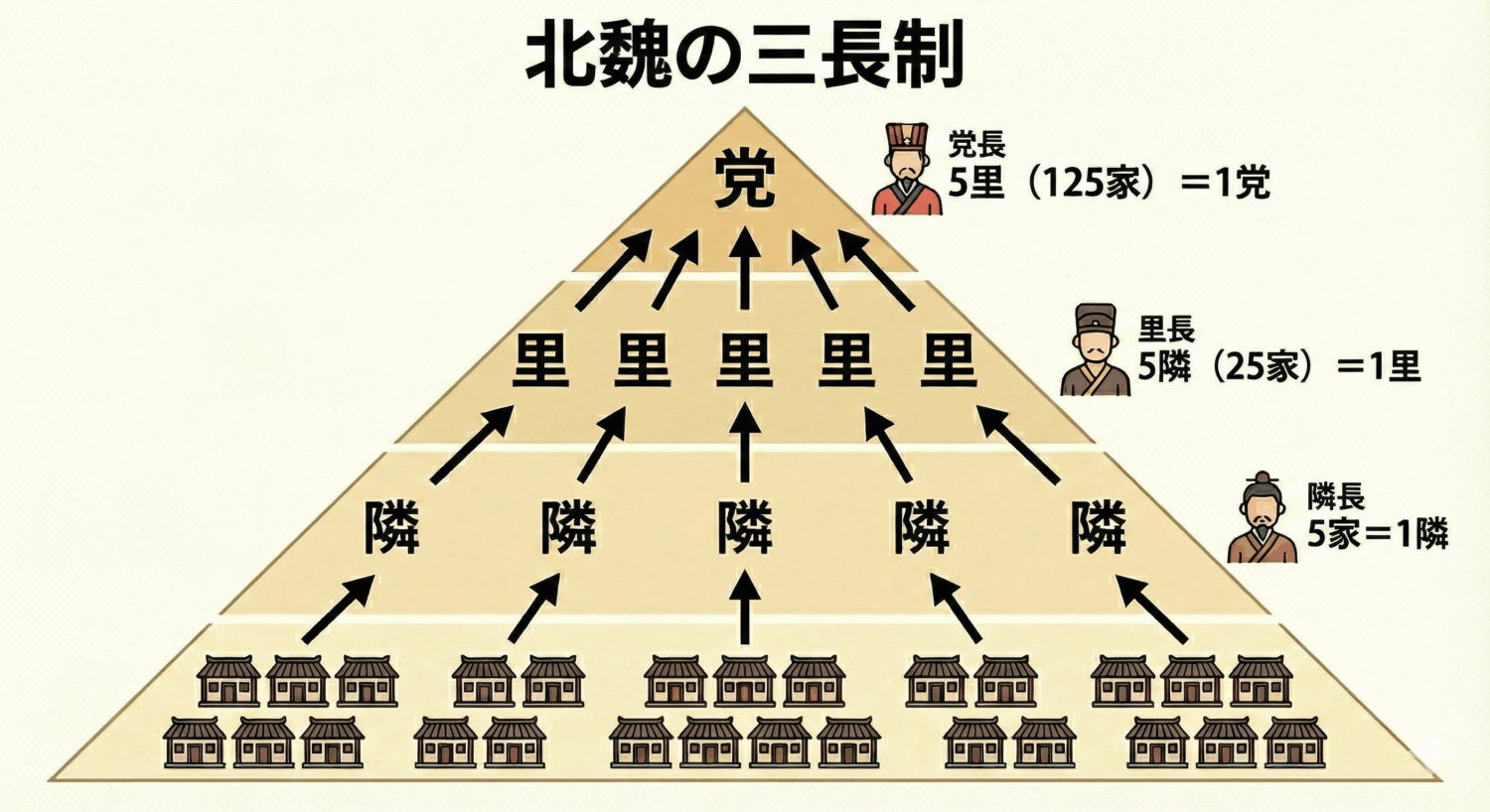 「三長制」の源流には、秦の商鞅による「什伍制」や魏晋の「里甲制」といった古い統治方式がありましたが、北魏はこれを国家規模の社会管理システムとして完成させました。