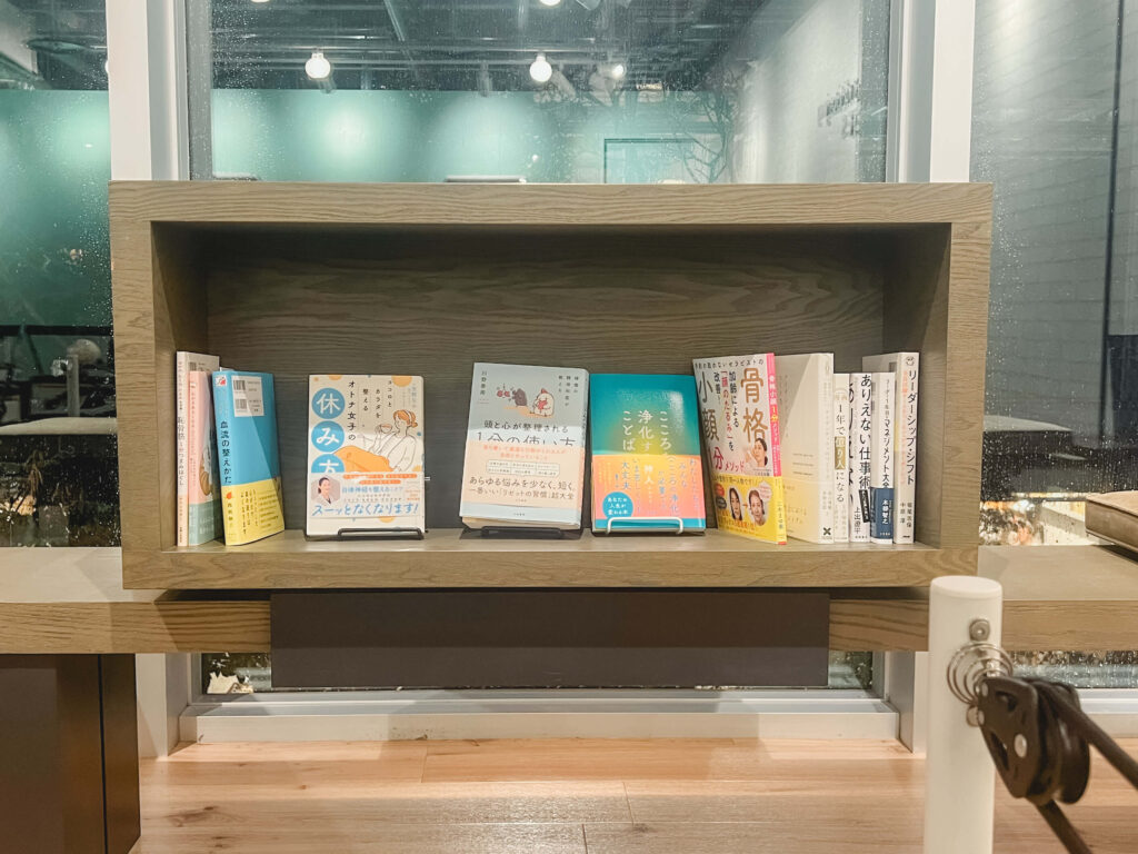スタジオ内には、蔦屋書店のコンシェルジュが選書した本が並んでいます。毎月新しく追加されるブックコーナーでは、レッスン後30分、スタジオ内で本を読んでもOK。