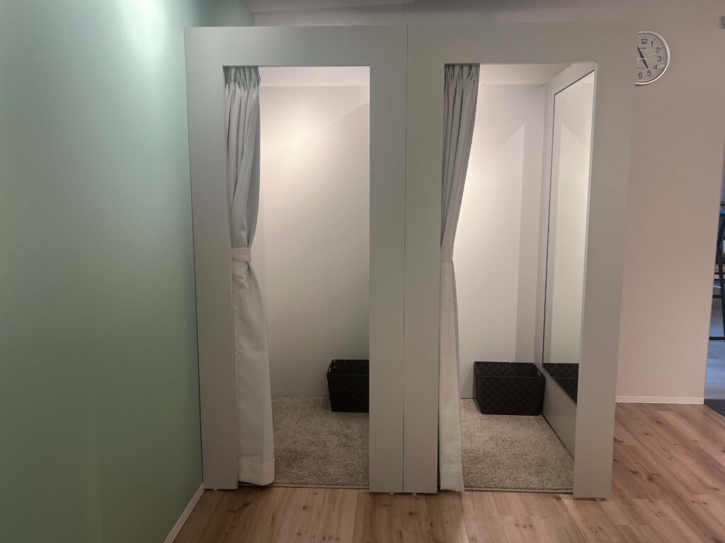 この日は1階のスターバックスコーヒーで仕事をして、体を動かしたくなってきたところで、いざ体験レッスンへ。スタジオに入ると更衣室が2つありました。前後の予定があっても、スタジオ内で着替えが可能です。