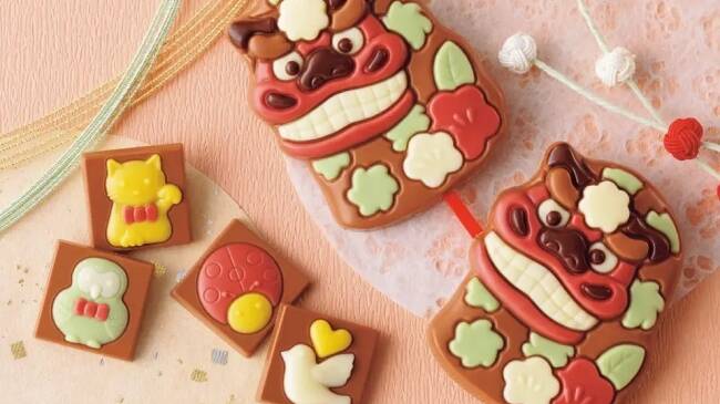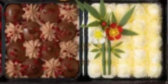 『頌春ショコラ』は、チョコレートとヘーゼルナッツのムースの間にチョコチップとフランボワーズを加えてアクセントにし、クリームとガナッシュで市松模様を表現。『花暦ドゥーブル』は、北海道産生クリームを絞りお正月仕様に仕立てた、ミルキーで口どけなめらかなドゥーブルフロマージュです。