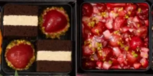 『福寿アソート』は、ピスタチオダマンドの上にカスタードクリームと苺を飾ったケーキと、チョコレート生地でほろ苦いカフェカラメルクリームを挟んだケーキ。『新春ベリー』は、甘酸っぱいベリームースの上に艶やかなベリーナパージュ、苺とフランボワーズを飾った華やかなムースケーキです。