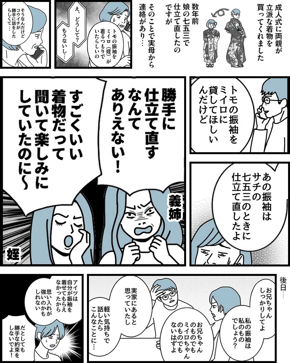 トモさんの実兄が振袖はまだあると思い込み、妻と娘に借りられると話したというのです。しかし振袖は七五三用に仕立て直したのでもうありません。