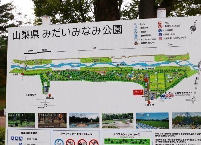 そこで妻と天気図を見ながら相談した。入笠山は午後には雨が止むらしい。けれど、雨上がりの登山道はどろどろになっている可能性が高い。却下。蓼科湖方面もアウト。そうして見ていくと、山梨県は曇りで雨が降らなそうだった。そのあたりに「みだいみなみ公園」というのがあるらしい。よし、決まり。