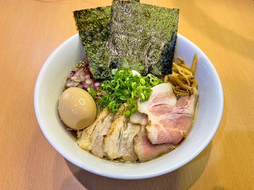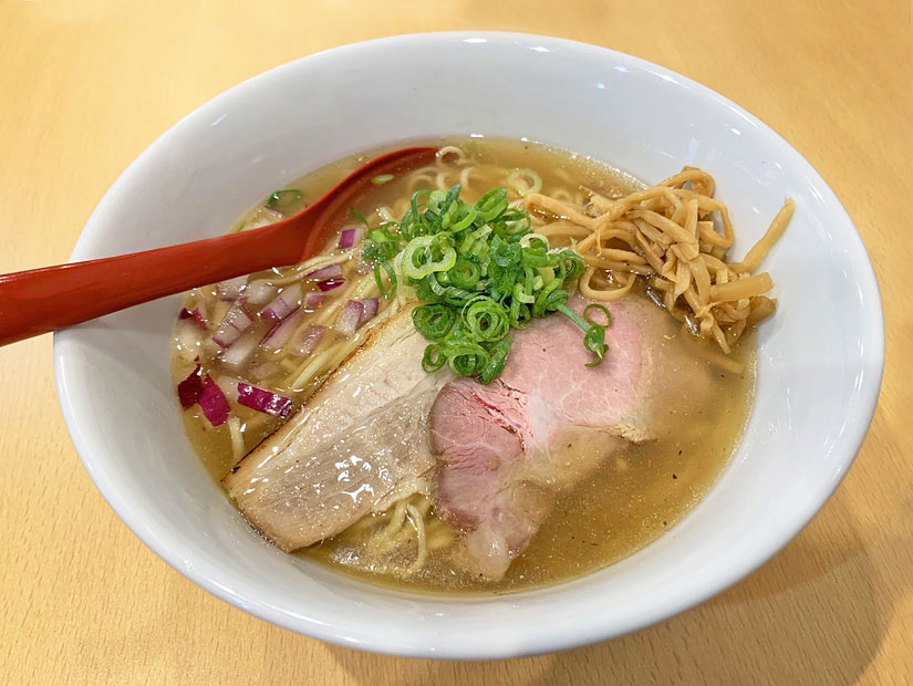 貝出汁と鶏清湯のスープに、厳選したトビウオを高温で焼き上げ、じっくり乾燥させて取った「焼きあご」の出汁を合わせた「焼きあごと貝のらぁ麺」(950円)。