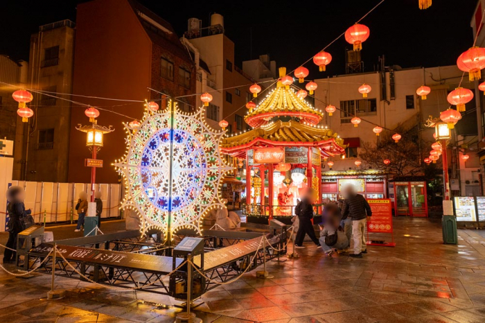 中央の南京町広場では高さ6.8mの中国風「あづまや」にライトアップが施され、あづまやを囲むようにたくさんの提灯が吊るされていました。