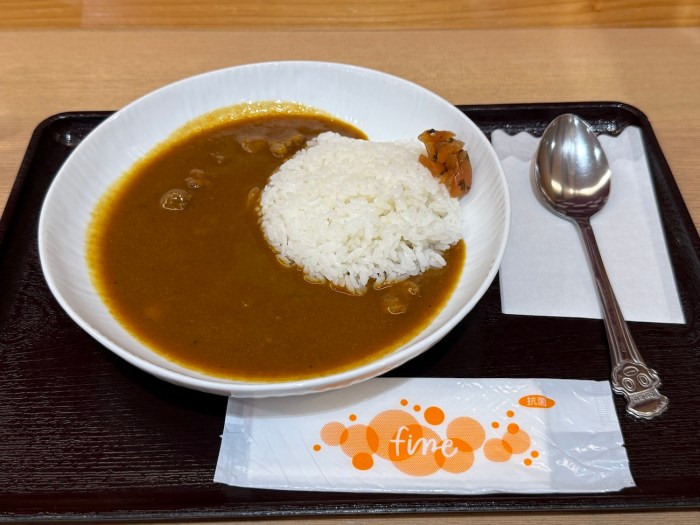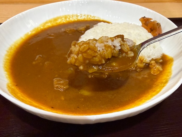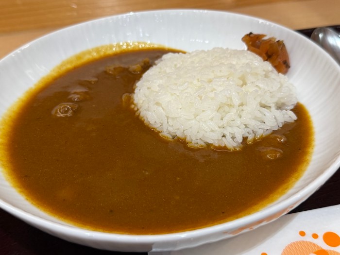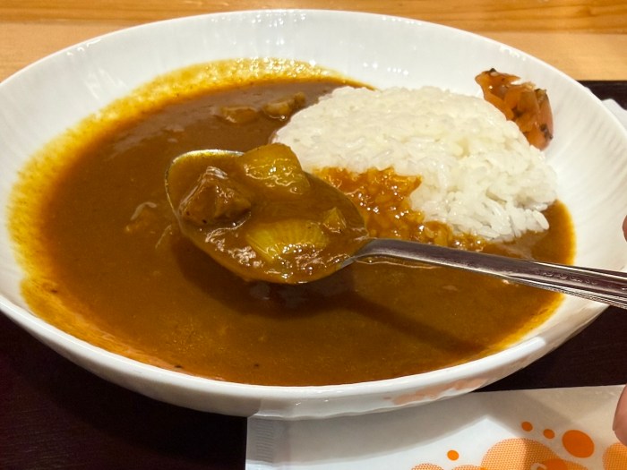 昔ながらの優しい味を想像していたが、実際は思ったよりも辛口でスパイシー。しっかりとパンチのある味わいで、現代的なカレーに近い印象。フルーティーな甘みも感じられる。具材は少ないものの、カレー自体の味はしっかりしていて満足感がある。