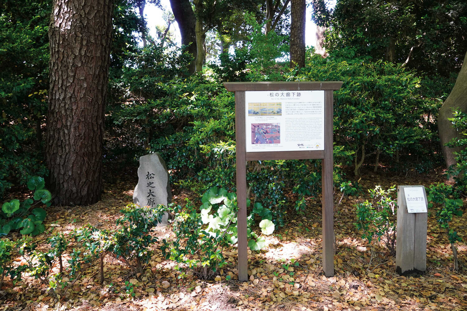 本丸の大広間と将軍の対面所を結ぶ廊下があった場所。浅野内匠頭(あさのたくみのかみ)が吉良上野介(きらこうずけのすけ)に斬りつけた刃傷事件が起きたところとして知られる。