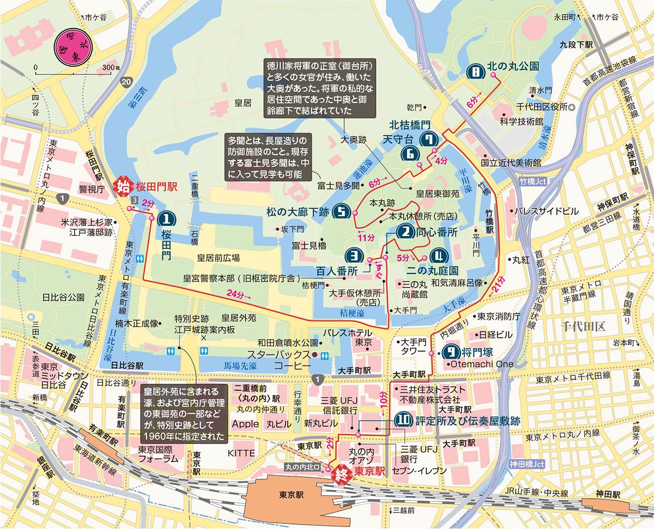 地下鉄有楽町線桜田門駅→(2分/0.1㎞)→桜田門→(24分/1.6㎞)→同心番所→(徒歩すぐ)→百人番所→(5分/0.3㎞)→二の丸庭園→(11分/0.7㎞)→松の大廊下跡→(6分/0.4㎞)→天守台→(4分/0.3㎞)→北桔橋門→(6分/0.4㎞)→北の丸公園→(21分/1.4㎞)→将軍塚→(10分/0.7㎞)→評定所及び伝奏屋敷跡→(2分/0.1㎞)→JR・地下鉄東京駅