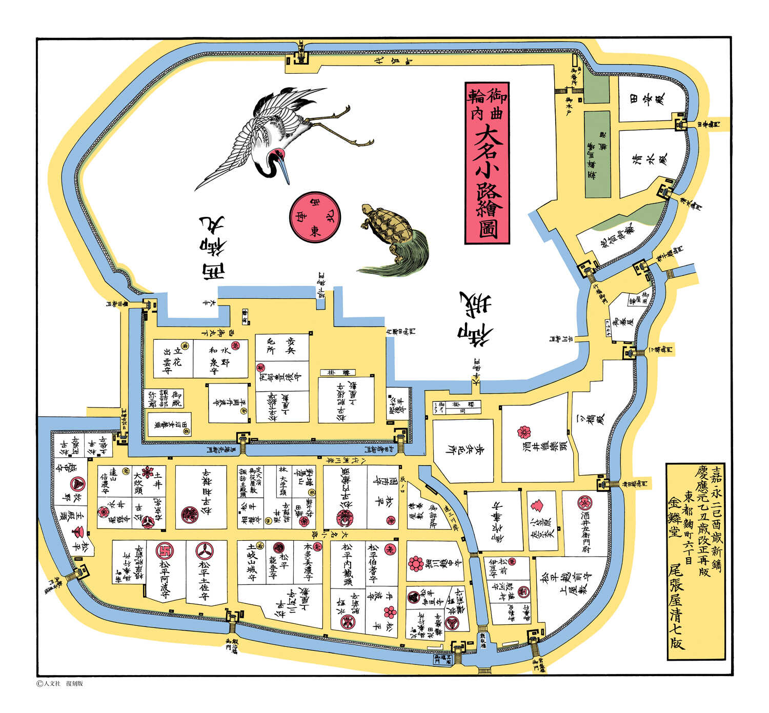 江戸城は太田道灌(どうかん)により長禄元年(1457)に築城。徳川家康が入府して以降も拡大整備され、徳川3代将軍家光の治世に完成したといわれる。江戸城を囲む濠の内側を内曲輪内といい、その中心にある御城内は記載に差し障りがあるため、切絵図には描かれていない。この一部が現在の皇居東御苑であり、同心番所や富士見櫓などが往時を偲ばせる。