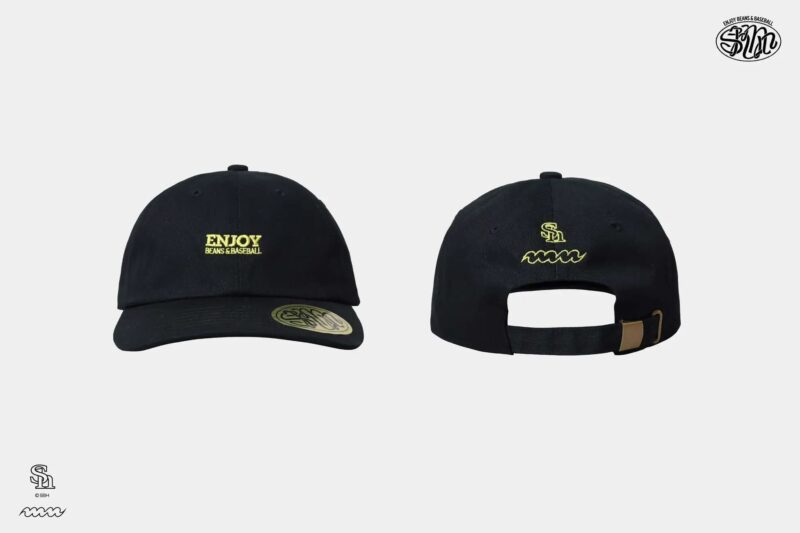 “ENJOY BEANS & BASEBALL”のメッセージ刺繍を施したベースボールキャップにはソフトバンクホークスとマヌコーヒーのロゴが配置されています。