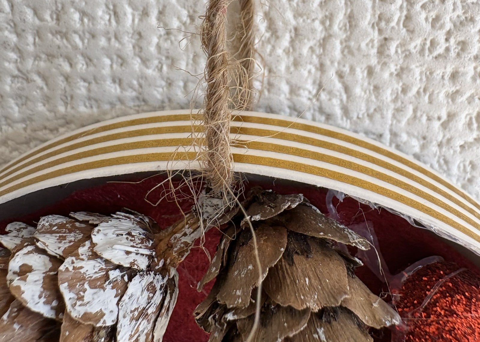 フェルトの上に、松ぼっくりやオーナメントなど好みの装飾を配置し、グルーガンやボンドで貼り付けます。