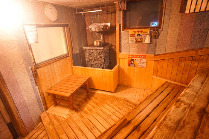 女性側はオートロウリュ、男性側は大鍋の水で湿度を保ち、心地よく汗を流せます。