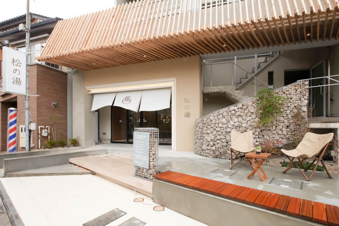 せせらぎ通り沿いににある、「松の湯」は、歴史と新しさを感じる銭湯。