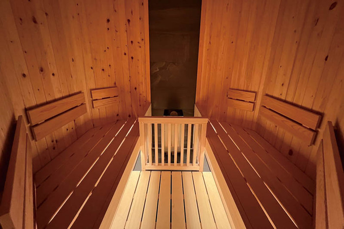 「しあわせの湯」のサウナは、調湿作用に美容健康効果があると言われる"黄土壁"が特徴。