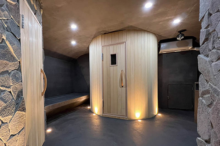 洞窟をイメージした円形のサウナ室は、最大3名まで利用可能。