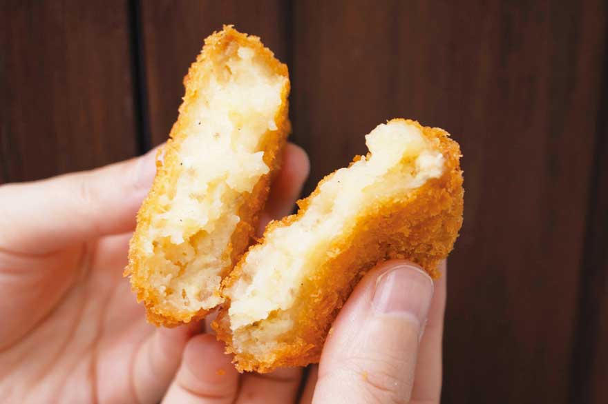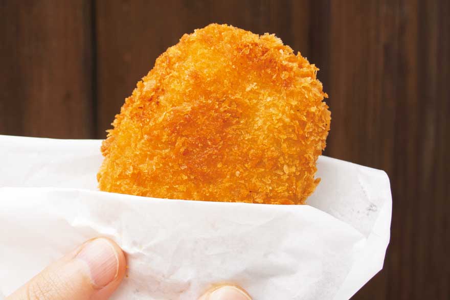 ホクホクのじゃがいもがぎっしり詰まった「足助コロッケ」(130円)。
