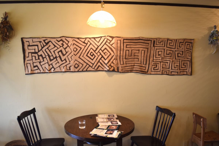 壁の真ん中には「クバ布」というアフリカで作られた約100年前の布がかけられ、とってもいい雰囲気。お店には他にも、各地の蚤の市や雑貨屋を巡って集めてきたもので溢れています。
