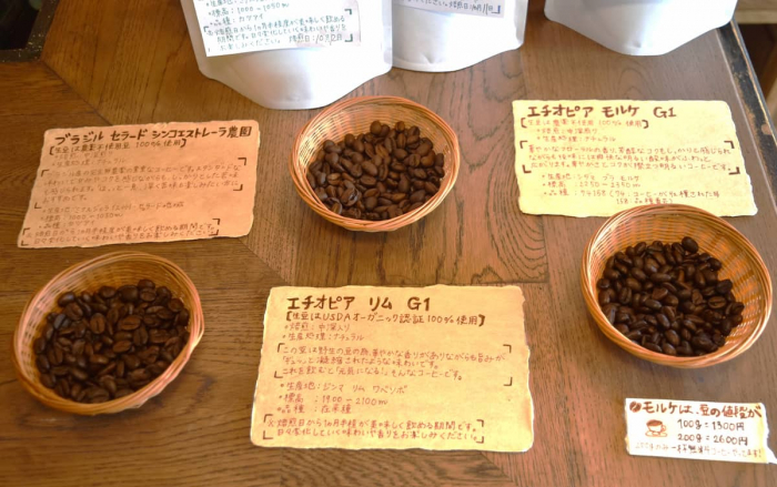 そんなこだわりの詰まった店内で、毎日のように行っているという焙煎の様子を見せていただきました!現在コーヒー豆のラインナップは、エチオピアの「リム」と「モルケ」、ブラジル・セラードのシンコエストレーラ農園の豆の3種。無農薬で無燻蒸のナチュラル(天日干し)を選んでいます。