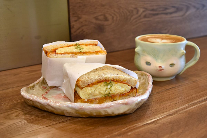 無着色のエサで育ったニワトリの卵で作った少し白いオムレツを「フロイン堂」のパンに挟んだオムレツサンドは、芳醇なバターの香りと有機トマトソースの酸味が効いて絶品!カフェラテとも相性抜群です。