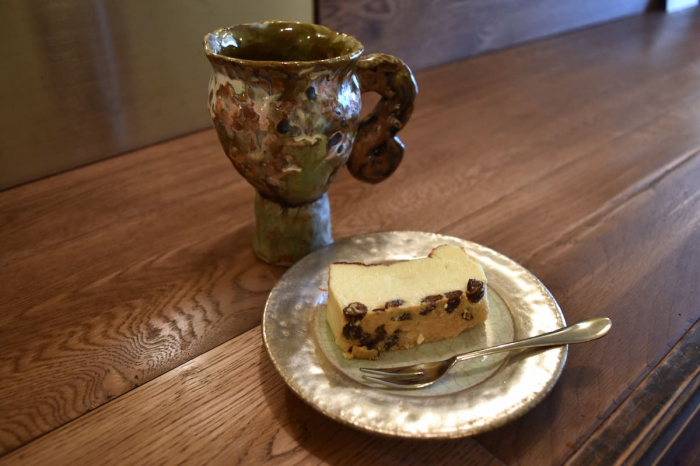 自家製ラムレーズン入りのバスクチーズケーキは、粉類を一切使っていません。滑らかな舌触りと、はちみつでほんのり加えた甘さが◎。