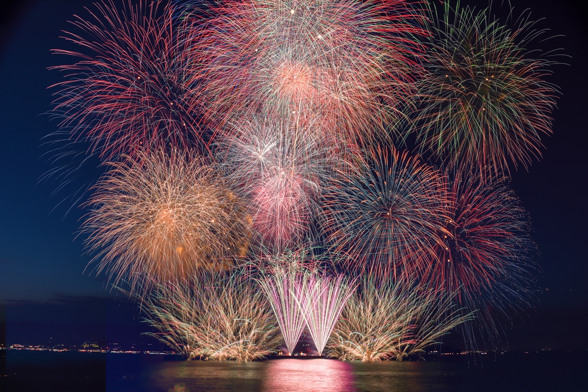 秋田の「大曲」、新潟の「長岡」と並び、日本三大花火大会の一つに数えられる伝統ある花火競技大会。全国から一流の花火師が集い、その技を競い合います。「スターマインの部」「10号玉の部」「創造花火の部」の三部門で構成され、最高峰の芸術的な花火を堪能できます。