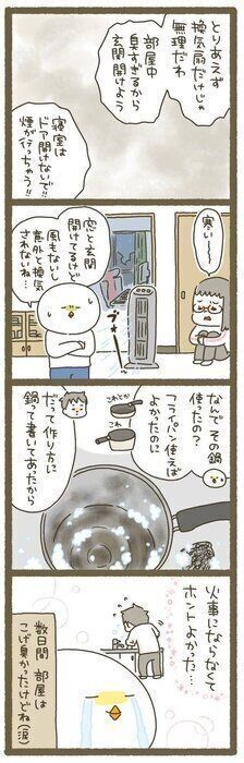 だって、なんかこげ臭いねと話しをしながら玄関を開けたら、視界が幻想的なくらい真っ白だったんですもの。