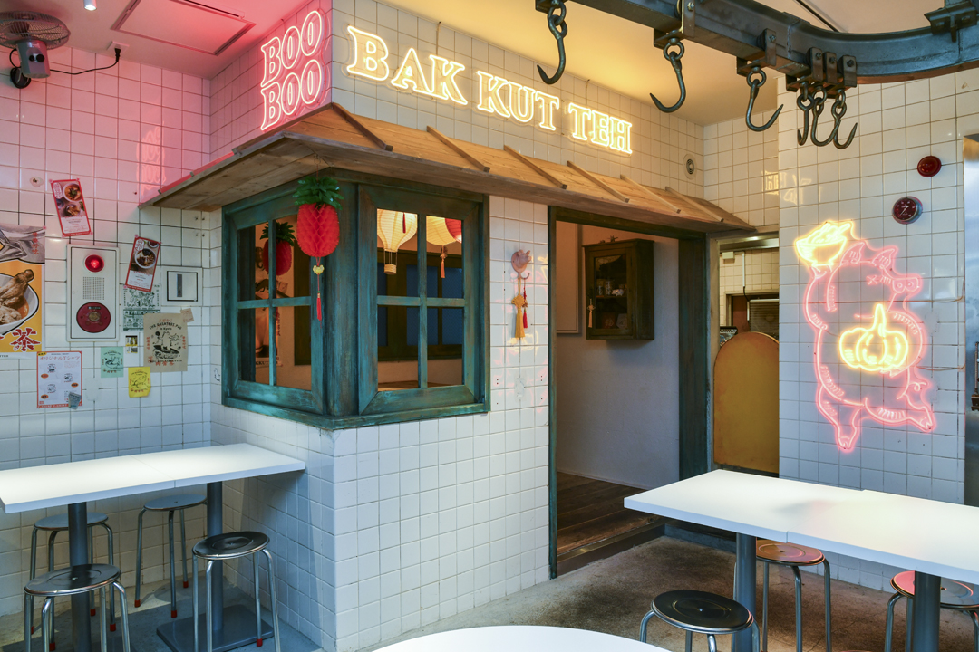 入って左手にコーヒースタンド、右側にはクラフトビールのタップが並ぶビアパブがあり、奥へ進むとバクテー専門店……というユニークな造りの店内。色とりどりのネオンが光るタイル張りの空間でコーヒーやクラフトビールを飲む、という楽しみ方もできる。