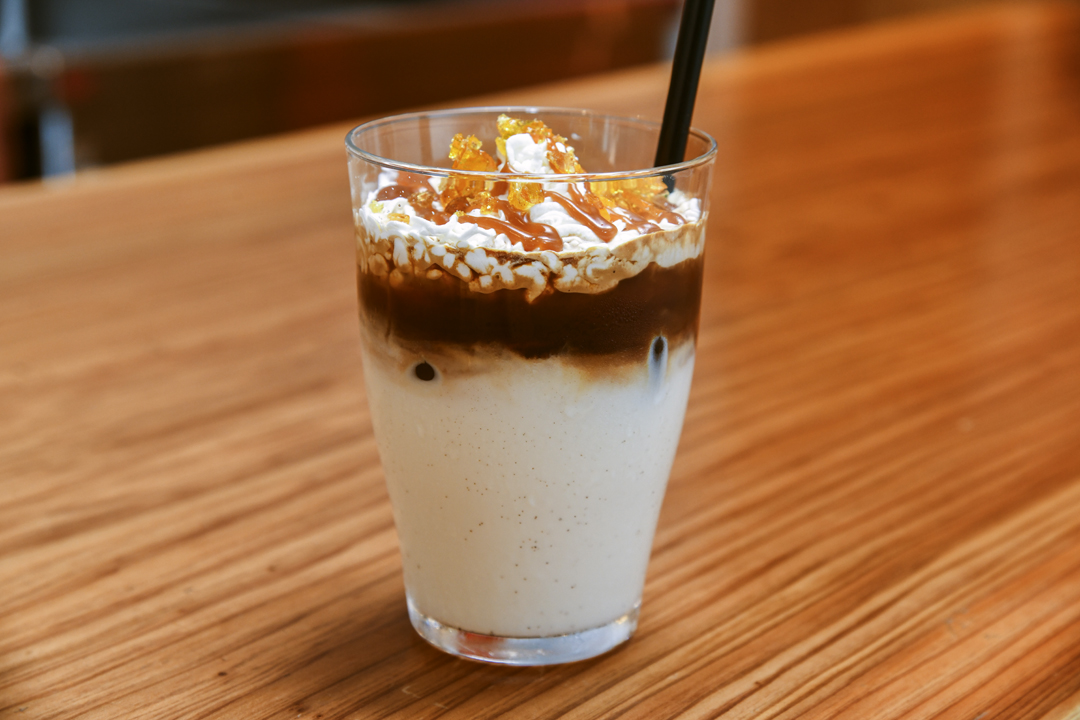 「キャラメルラテ」は「DRIP & DROP COFFEE SUPPLY」創業以来の定番人気ドリンク。ホットとアイスの2種類があり、それぞれ違った楽しみ方ができる。ホットは、温かいカフェラテに生クリームを焦がして作る自家製キャラメルソースを溶かし込んだ一杯。ほろ苦の甘すぎない味わいがちょうどいい。