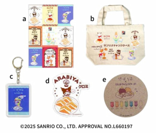 (a)「A4クリアファルvol.2」(1枚/440円)、(b)「ランチトートバッグvol.2」(1個/1,870円)、(c)「アクリルキーホルダー」(1個/770円)、(d)「ステッカーS」(1枚/550円)、(e)「コースター」(1枚/880円)