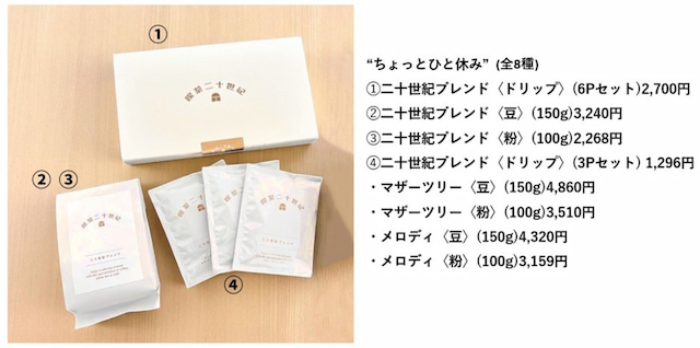 販売されるのは、厳選された質の良い豆を独自の比率でブレンドした「二十世紀ブレンド」のセットや、「喫茶二十世紀」オンラインストアの人気商品。10月に登場したばかりのアイテムや、「純喫茶ハンシン」限定アイテムもラインナップします。オンラインストアの商品を実際に手に取って見ることができる、貴重な機会です。