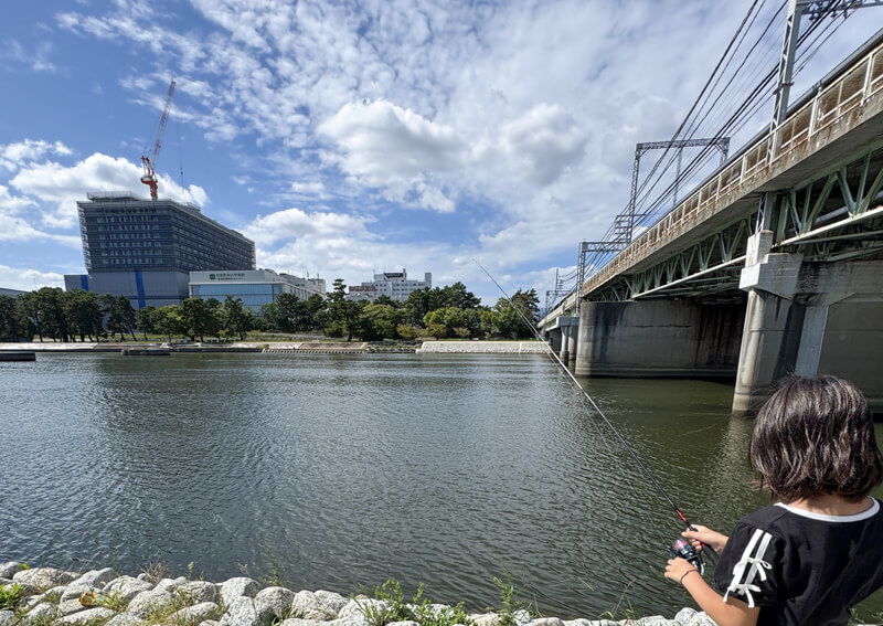 釣り場までは自宅からバスと電車を乗り継ぎ、わずか30分ほどで到着。ポイントは阪神・武庫川駅を降りてすぐの高架下です。都市部でありながら水辺の自然を感じられる場所で、日陰も多く足場もよいため、駅からのアクセスを考えると最高の釣り場といえるのではないでしょうか。