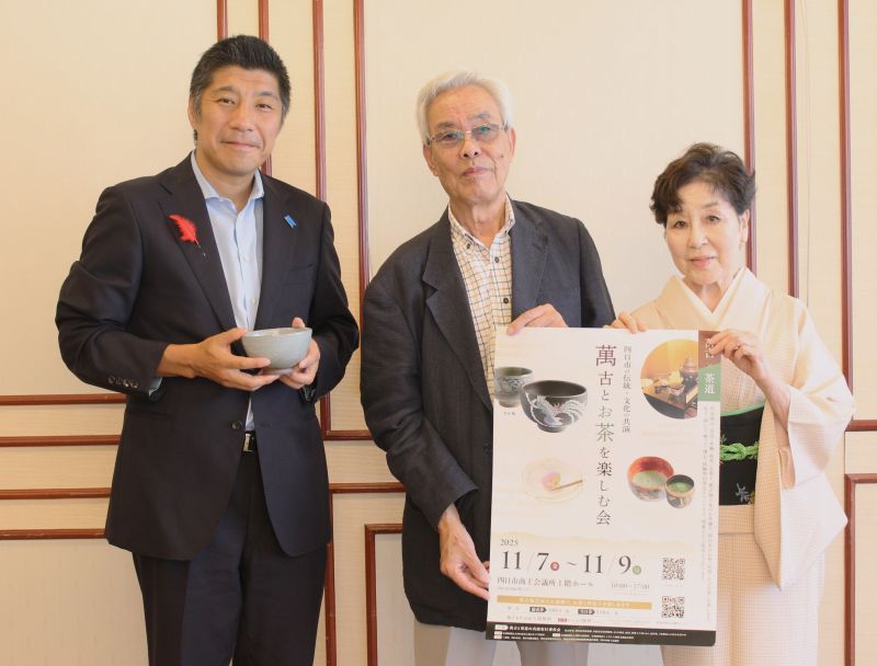 「楽しむ会」は11月7日から9日まで、商工会議所1階ホールであり、四日市の陶芸家15人が茶碗を提供、四日市の4流派の茶道の先生、和菓子店、製茶会社などが委員会のメンバーに入って主催する。四日市の抹茶を四日市の萬古焼の茶碗で、四日市の茶道の先生により、菓子も四日市のものを使う、まさに四日市の茶会になるという。
