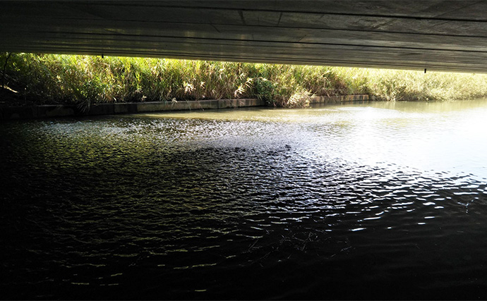 まずは上流から川の様子を見ながら釣っていくが、ベイト(エサの小魚)が遡上していい感じだ。小さい橋脚の真下へ入るが、ここはかなり暗くてシーバスがベイトを待ち構える絶好のポイントだ。